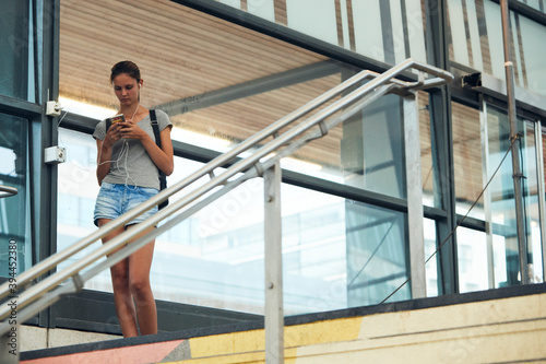 woman, adult, public transport, teenage, commuter, commute, people, phone, mobile phone, communication, wireless technology, young, holding, missy, building, outdoors, standing, full-length, horizontal, 1, day, looking down, colours, infrastructure, sweden, scandinavia