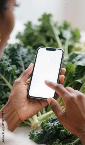 woman, smartphone, kale, hand, technology, healthy, food, green, vegetable, digital, screen, touch, mobile, device, lifestyle, nourishment, diet, organic, fresh, eating, health, modern, background, closeup, portrait, sideview, black, skin, finger, thumb, white, blank, interface, app, communication, connectivity, garden, plant, leaf, natural, sustainable, wellness, home, kitchen, meal, preparation, nobody, holding, display