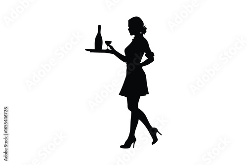 waiter, waitress, woman, female, serving, drink, bottle, glasses, tray, carrying, service, hospitality, eatery, bar, event, party, celebration, elegant, professional, silhouette, black, and, white, isolated, background, figure, person, human, outline, profile, standing, walking, fashion, style, uniform, apparel, clothing, high, heel, vintage, retro, art, graphic, design, illustration