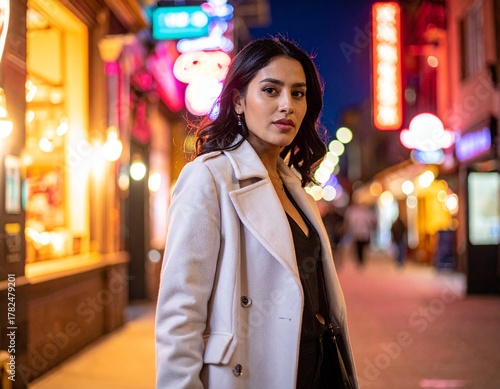 woman, walking, night, street, neon, cafes, signs, city, urban, nightlife, female, fashion, lifestyle, outdoors, people, person, adult, caucasian, stylish, leisure, socialising, one person, full-length, evening, destination, vibrant, colourful, light, blur, motion, downtown, entertainment, modern, cool, dynamic
