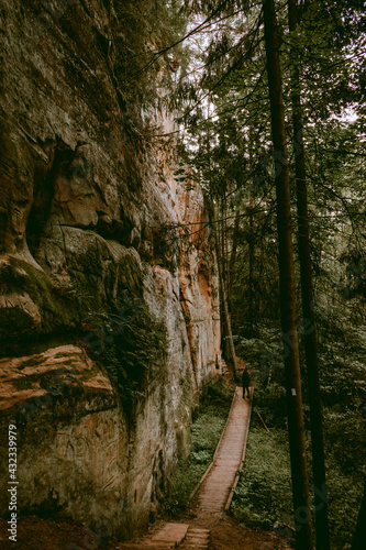 Woman walking on the forest hiking trail beside the Licu Langu sandstone cliff near Gauja river in Latvia