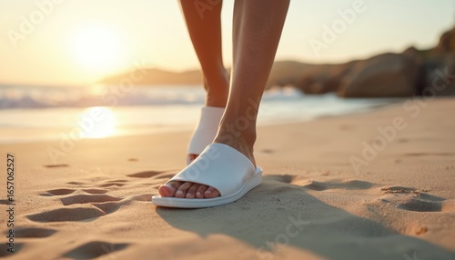 Woman walks on beach sand wearing white comfortable sandals. Footwear offers arch support and relief for healthy feet. Relaxing seaside vacation stroll at sunset. Perfect for summer footwear fashion.