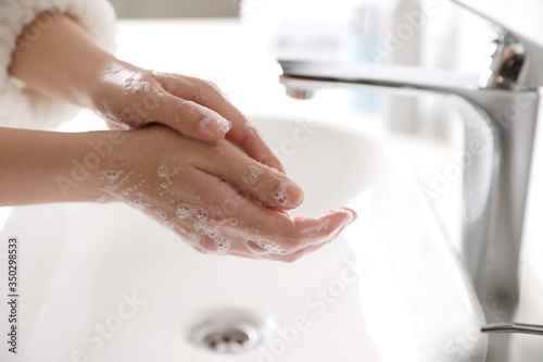 Woman washing hands with soap over sink in bathroom, closeup