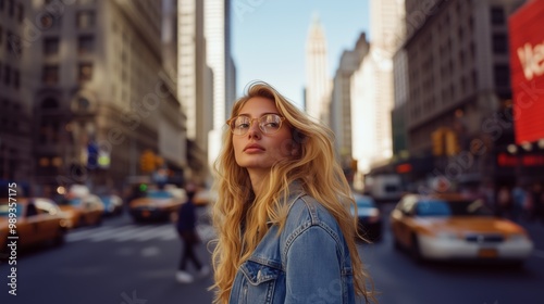 Woman wearing glasses with long light-blond hair standing in the middle of a busy city street