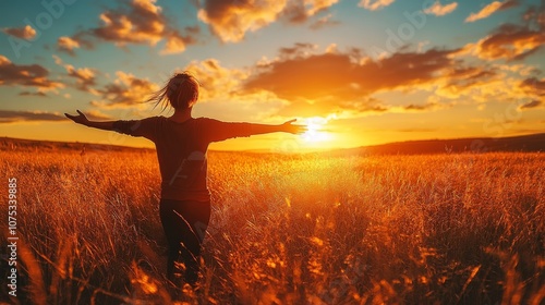 woman, field, sunset, sky, cloud, arm, outstretched, grass, gold, warm, light, silhouette, happy, nature, horizon, landscape, sun, ray, bright, meadow, tranquil, peaceful, freedom, joy, happiness, vibrant, evening, dusk, glow, beauty, open, hugs, hope, inspiration