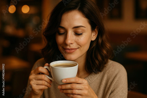 woman, coffee, cup, tea, drink, coffee, smiling, mug, beauty, hot, drink, people, person, 1, face, smile, holding, espresso, eatery, sitting, brunette, morning, indoor
