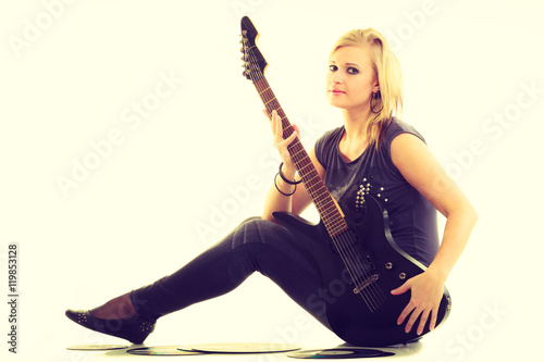 Woman with electrical guitar and vinyl record.