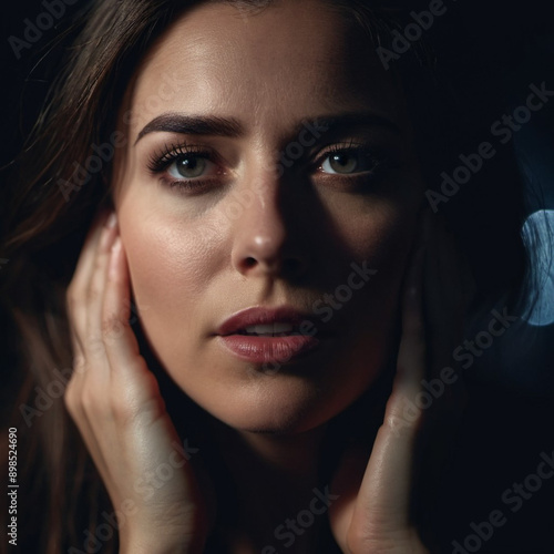 woman, stressed, face, closeup, portrait, eye, worried, expression, emotion, sorrowful, anxiety, stress, dark, shadow, lighting, dim, frowning, brow, grooved, night, troubled, human, psychology, mental, health, female, model, beauty, mouth, skin, lip, people, person, portraiture, shadow, intense, serious, thoughtful, introspective, vulnerable, pensive, emotional, generative, ai, fear, upset, worry, thoughtfulness, cry