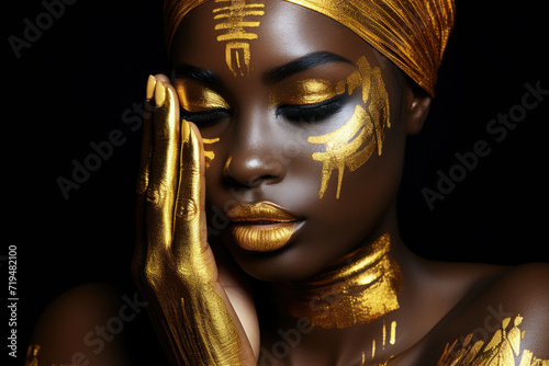woman, portrait, fashion, face, black, beauty, art, skin, paint, make-up, female, model, body, glamour, young, gold, fantasy, creativity, style, person, elegance, colours, studio, background, cosmetic, attractive, artist, sensual, lip, vogue, gold, lady, eye, dark, head, expression, decorative, adult, bronze, bright