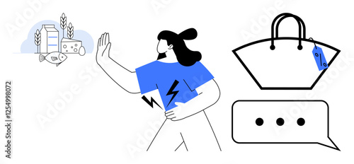 Woman with hand raised towards dairy products and wheat, focusing on a lightning bolt symbol on her shirt, handbag with a tag, and chat bubble. Ideal for healthy lifestyle, diet, choice, rejection