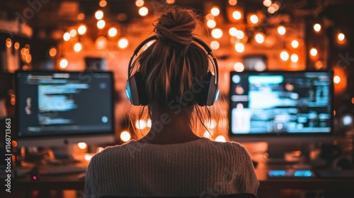 Woman with headphones coding on dual monitors in cozy, ambient-lit room.