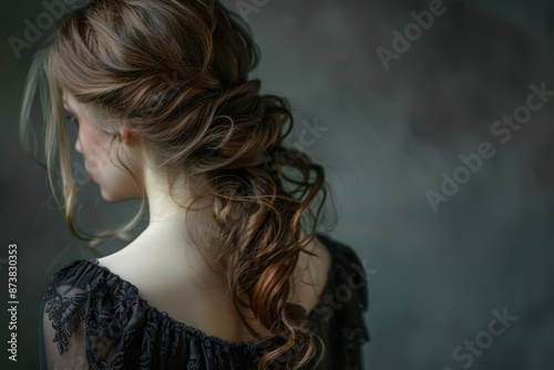 Woman with long hair wearing a black dress, An elegant lady with damp hair flowing down her back