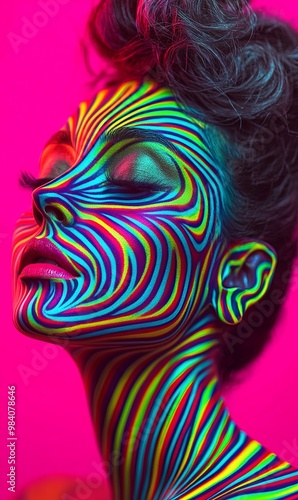 woman, neon, abstract, make-up, bold, pattern, electric, pink, blue, vibrant, beauty, green, creating, energetic, look, fashion, eye, hair, trendy, bun, striking, earphones, bright, edgy, portrait, colourful, lively, modern, face, chaos, weird, atmosphere, ar, art, job, id, background, model, female, design, people, party, light, make-up, creative, young, purple, disco, glamour