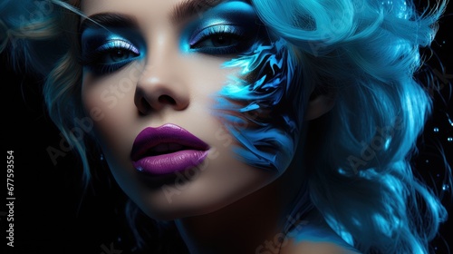 Woman with neon blue makeup, Dark background.