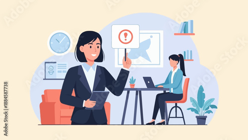 woman, signs, colleague, working, laptop, office, meeting, collaboration, business, professional, corporate, teamwork, discussion, presentation, strategy, planning, idea, concept, attention, warning, alert, notice, information, datum, report, analysis, research, learning, education, training, advice, guidance, management, leadership, employee, staff, personnel, job, career, success, growth, achievement, performance, productivity, efficiency, organisation, modern, flat, illustration