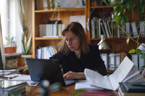 Woman working on laptop and analyzing documents at home office, illustrating remote work and productivity.