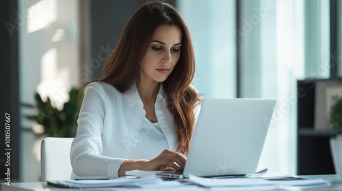 woman, working, laptop, office, desk, paper, white, shirt, keyboard, typing, sharpened, concentrating, business, professional, technology, modern, interior, light, window, view, bright, hair, brown, hand, finger, screen, document, table, chair, background, sunlight, grey, casual attire, sitting, focused, productive