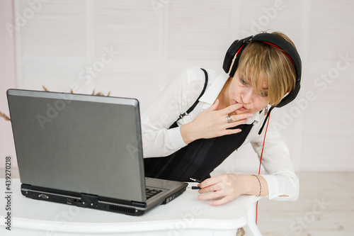 woman works at a laptop, wearing headphones and a microphone for communication