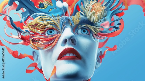 abstract art, fantasy art, woman, three-dimensional, render, digital artwork, face, portrait, colourful, vibrant, organic, shape, flower, blue, red, orange, yellow, white, texture, mask, eye, lip, hair, style, artistic, creative, imagination, artwork, design, illustration, painting, modern art, hallucinogen, intricate, detail, beauty, expression, emotion, flowing, whimsical, dreamlike