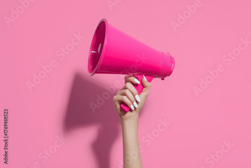 megaphone, holding, hand, woman, pink, background, announcement, communication, voice, speak, shout, loud, attention, message, marketing, protest, broadcast, advertising, alert, urgent, news, sale, promo, female, feminism, empowerment, power, loudspeaker, amplifier, studio, vibrant, colours, bright, bold, manicure, pop art, minimal, minimalist, copy space, speaker, shouting, speech, object