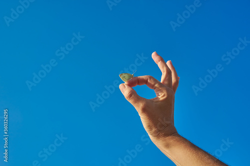 Woman's hand with a yellow butterfly, on a background of blue sky. Freedom, ok, happiness concept