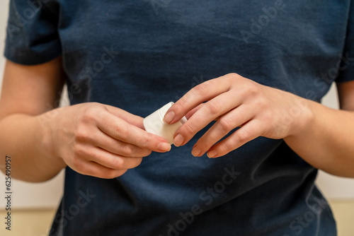 Woman's hands hold plastic jar (container). Cosmetic product.