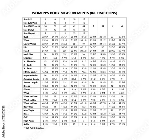 Women size chart measurements in inches fractions for bust, waist, hips, sleeve, shoulder, height guide. Standard sewing fashion tailoring reference female body proportions, US, UK, EU, Japan sizes.