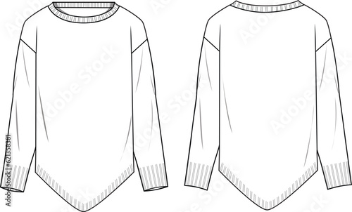 Women's Asymmetrical Hem Sweater- Technical fashion illustration. Front and back, white colour. Women's CAD mock-up.