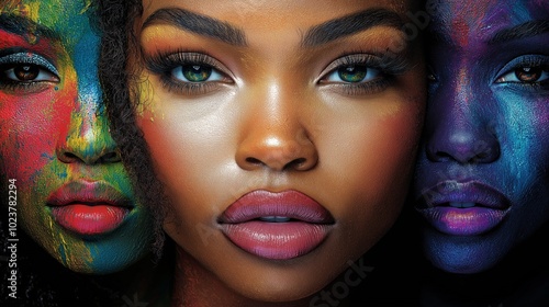 Women's faces symbolizing diversity, unity, and human connection with paint makeup to show identity and creative personality in each woman