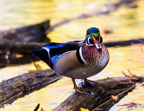 Wood duck male or Carolina duck is a species of perching duck found in North America. It is one of the most colorful North American waterfowl. Swimming in a lake ablaze with the colors of fall.