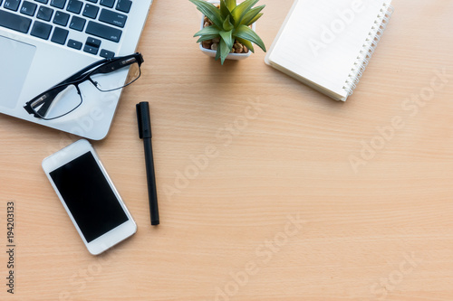 Wood office desk table with laptop,smart phone,notebook and pen, Top view with copy space, flat lay.