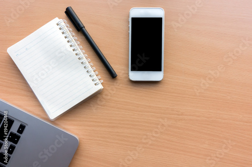 Wood office desk table with laptop,smart phone,notebook and pen, Top view with copy space, flat lay.
