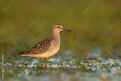 Wood sandpiper feeding in shallow water on the shore of Biebrza river in Biebrza national park