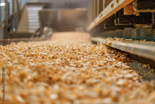 Wood shavings on a conveyor belt in a furniture factory create a mesmerizing texture