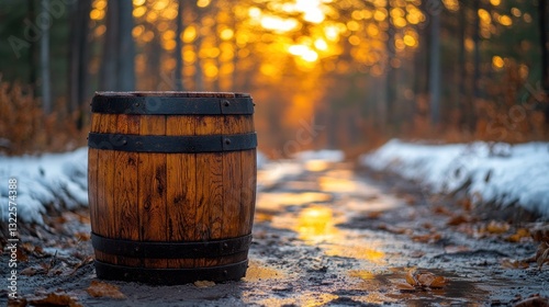 barrel, wood, wooden, forest, path, road, snow, winter, sunset, sun, autumn, fall, tree, nature, landscape, background, image, photo, picture, scenery, view, rustic, vintage, old, aged, brown, dark, light, gold, yellow, orange, cold, season, tranquil, serene, quiet, peaceful, environment, country, rural, dirt, ground, leaf, leaf, puddle, water