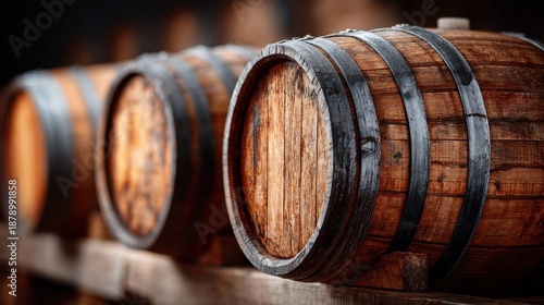 Wooden barrels in a row, perfect for aging wine or spirits