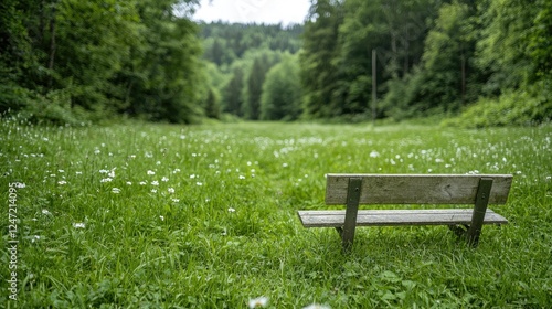 Wooden bench in a meadow, forest background, peaceful scene, nature relaxation
