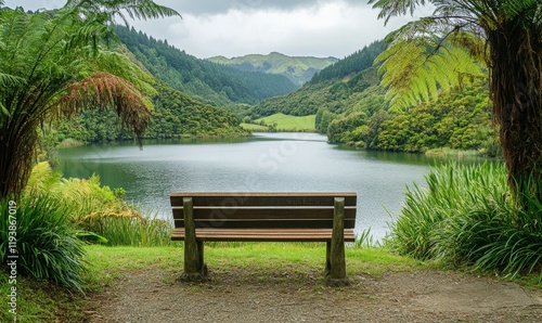 Wooden bench overlooking serene lake with lush greenery , natural beauty, nature scenery, rustic ambiance