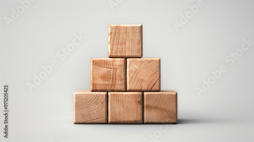 Wooden blocks arranged in pyramid shape create simple yet engaging visual. natural texture and warm tones of wood evoke sense of creativity and playfulness.