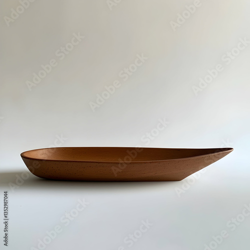 Wooden boat-shaped serving dish on white background; minimalist home decor