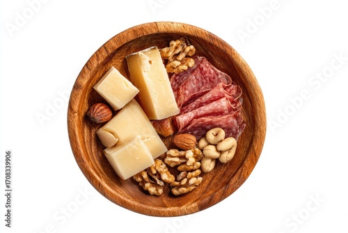 cheese, salami, nut, almond, wooden, bowl, snack, food, italian, deli, dairy, cured, protein, healthy, delicious, epicure, snacking, treat, mediterranean, selection, variety, ingredient, dish, plate, top, view, isolated, white, background, composition, arrangement, food photography, closeup, horizontal, slice, piece, hard, soft, red, brown, gold, crispy, savoury, natural