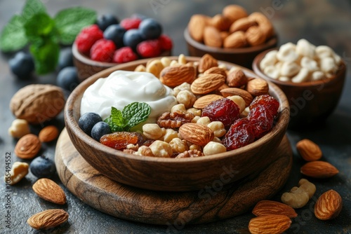 bowl, wooden, yogurt, nut, almond, walnut, cashew, dried, fruit, grape, cranberry, berry, blueberry, raspberry, mint, leaf, green, brown, white, red, black, healthy, snack, food, delicious, tasty, natural, organic, breakfast, dessert, sweet, tart, crunchy, creamy, fresh, closeup, dark, background, texture, grain, rustic, table, plate, surface, still, life