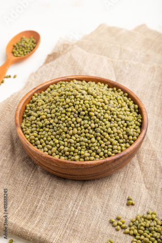 Wooden bowl with raw green mung bean and wooden spoon on a white background. Side view, close up.