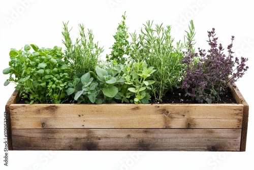 rosemary, sage, thyme, oregano, basil, marjoram, herb, garden, planter, wooden, box, container, gardening, cooking, favor, aroma, fragrant, culinary, fresh, green, purple, natural, organic, healthy, spice, seasoning, vegetation, plant, dirtied