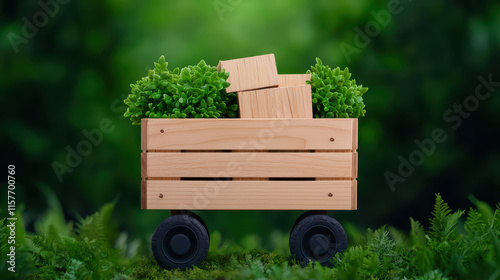 wooden cart filled with greenery and blocks, set against lush background, evokes sense of nature and tranquility