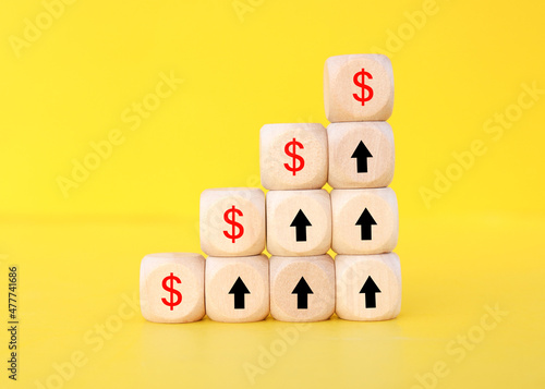 wooden cube block with arrow icon pointing to dollar symbol icon,