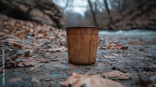 cup, wooden, outdoors, nature, leaf, ground, stream, rock, autumn, fall, brown, forest, natural, scenery, creek, dirt, river, foliage, environment, wood, calm, still, object, texture, light, shadow, detail, close, up, view, horizontal, photo, photo, image, landscape, background, foreground