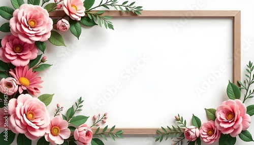 wooden frame, pink flower, green leaf, white background, floral arrangement, wedding invitation, background image, floral arrangement