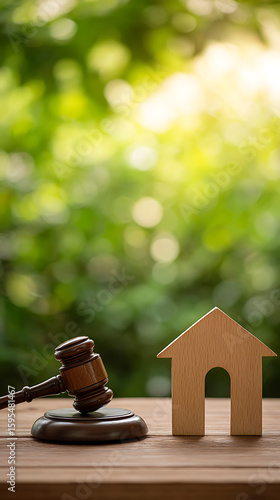 Wooden gavel and house symbol on a table with green bokeh background auction