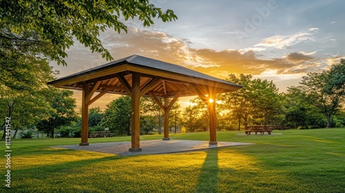 gazebo, park, sunset, sun, sky, cloud, tree, grass, green, yellow, wood, wooden, beam, structure, pavilion, landscape, nature, evening, light, gold, ray, summer, tranquil, serene, peaceful, calm, beautiful, scenic, view, picturesque, relaxing, ambience, atmosphere, picnic, table, bench, shadow, dawn, dusk, sunrise